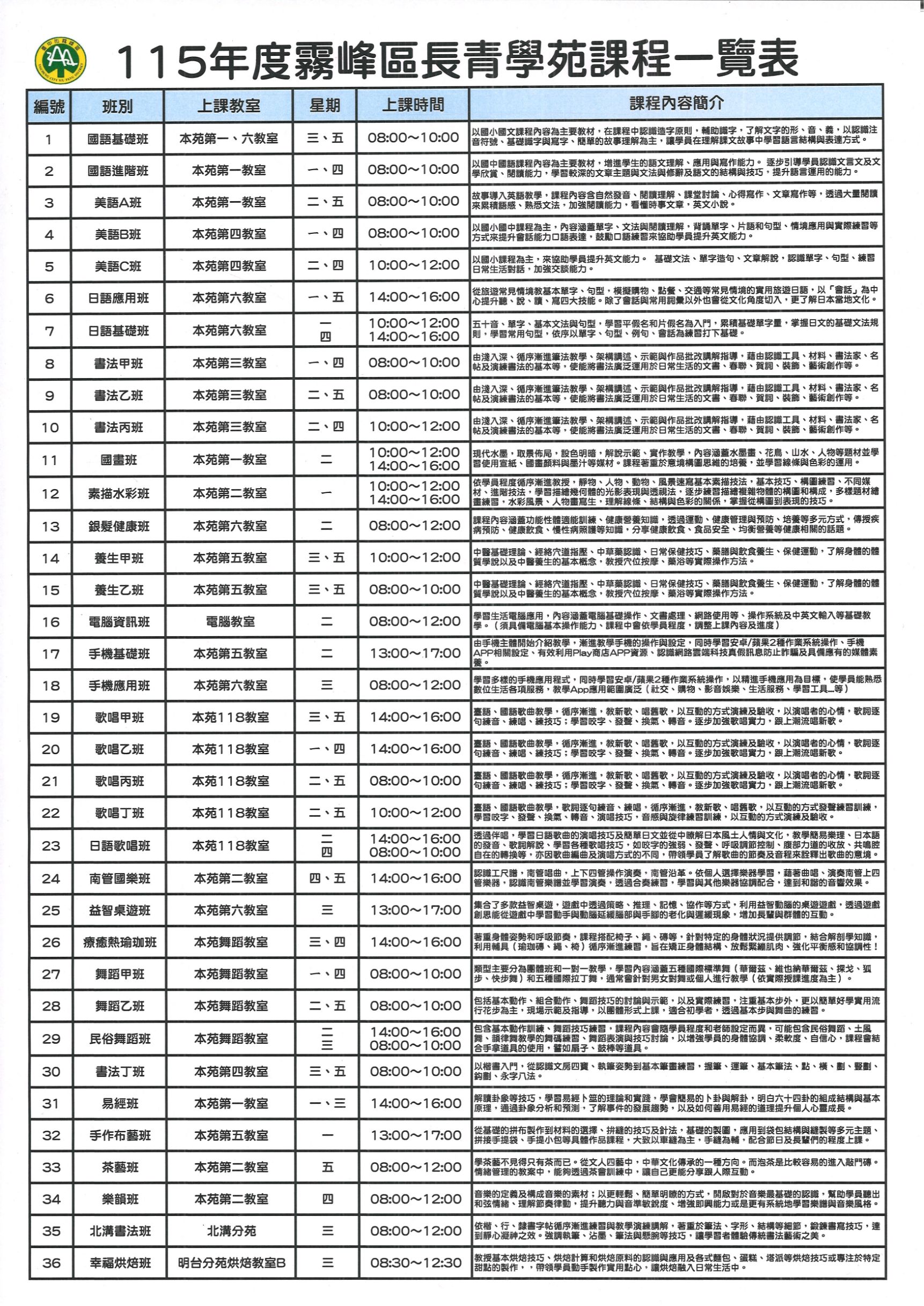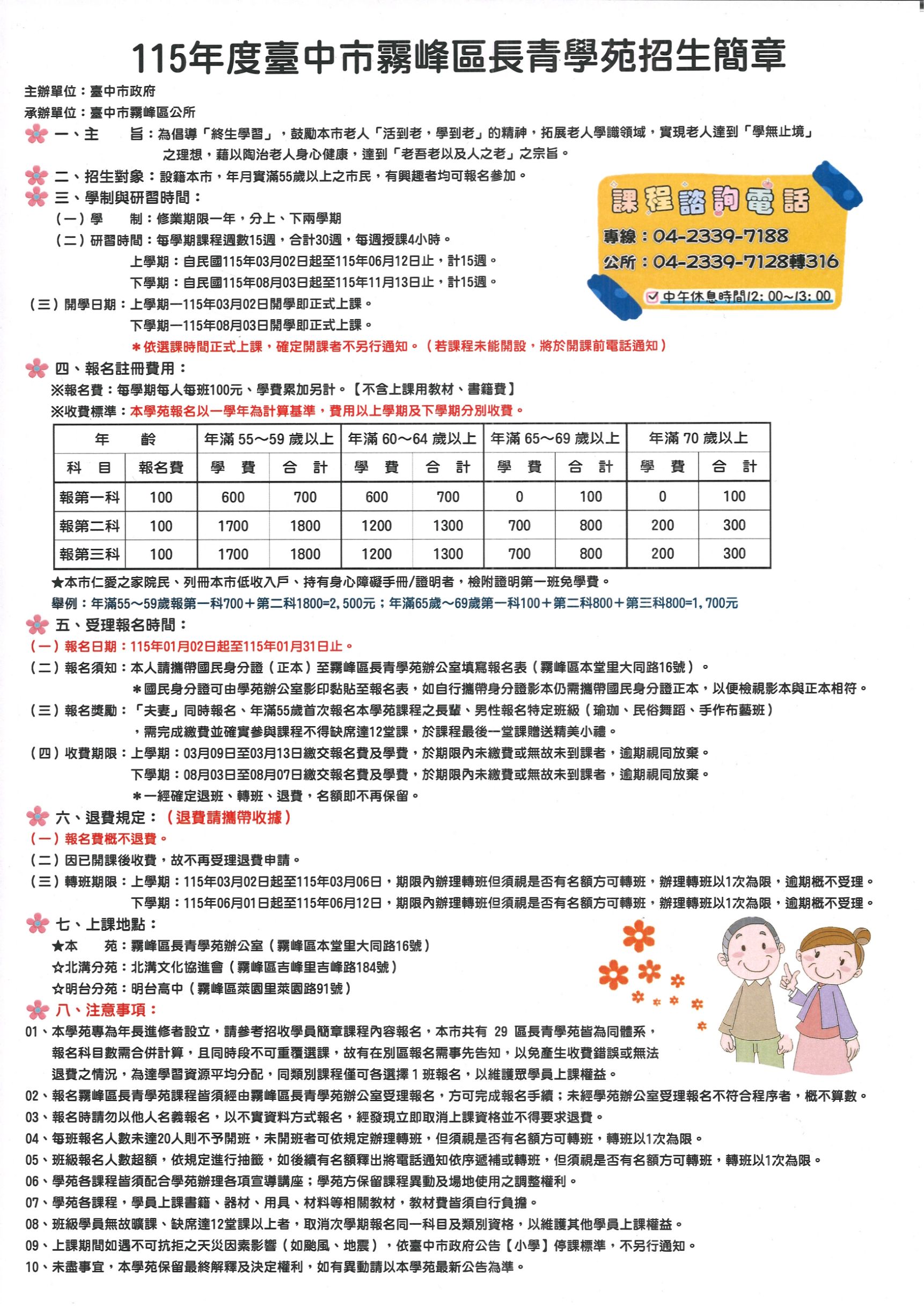 (二)報名須知:本人請攜帶國民身分證(正本)至霧峰區長青學苑辦公室填寫報名表(霧峰區本堂里大同路16號)。