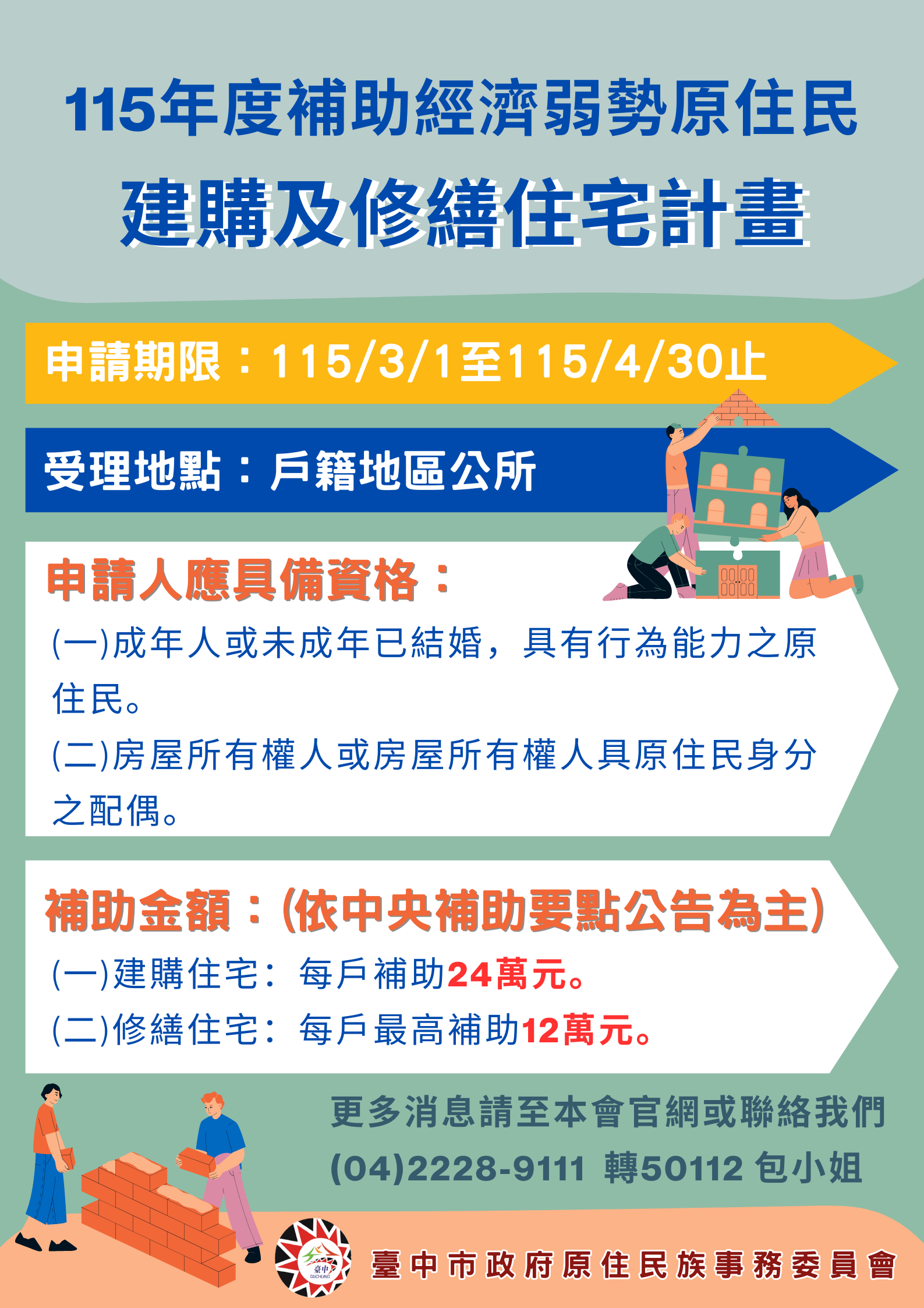原住民族委員會「115年度補助經濟弱勢原住民建購及修繕住宅計畫」自即日起至114年4月30日止受理